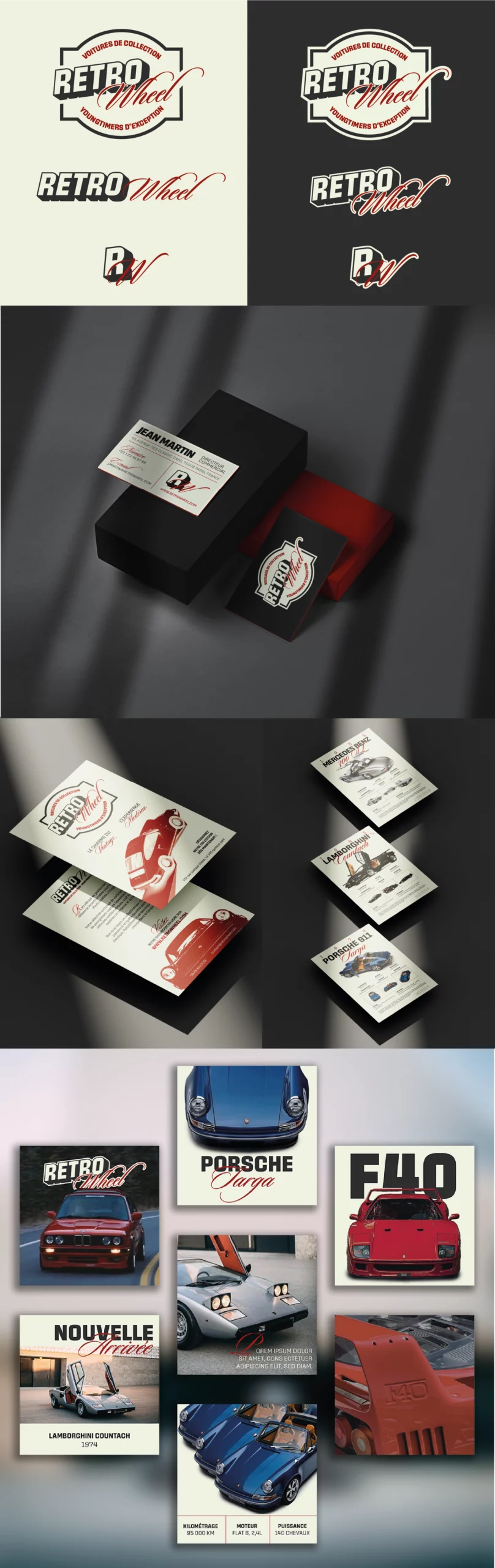 L'ensemble des supports (cartes de visite, fiches prix, flyers, et feed Instagram) ont été conçus pour respecter cette cohérence visuelle, créant une identité forte et immédiatement reconnaissable pour RetroWheel.